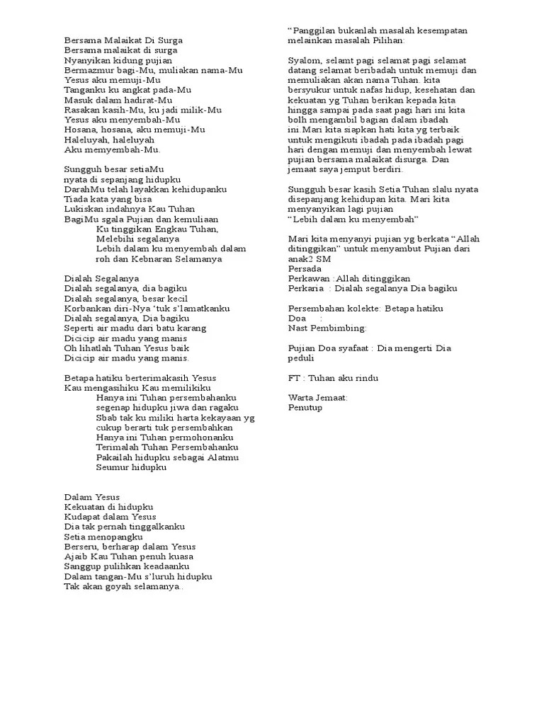 Terima kasih atas ayatnya, saya ijin untuk menyebar luaskan nya ya. Tapi di gkpi, sejak berdirinya pada tahun 1964 yang lalu, saat mengumpulkan persembahan jemaat tidak menyanyikan pujian. persembahan kita, entah wujudnya uang (kolekte) atau barang, tidak kita letakkan di atas altar, tetapi di tempat yang pantas di panti imam, misalnya disediakan tempat khusus di sekitar altar, dengan posisi juga tidak lebih tinggi dari altar. persembahan kasih kapel provinsialat msc indonesia. Kumpulan lagu rohani saat pembukaan ibadah.